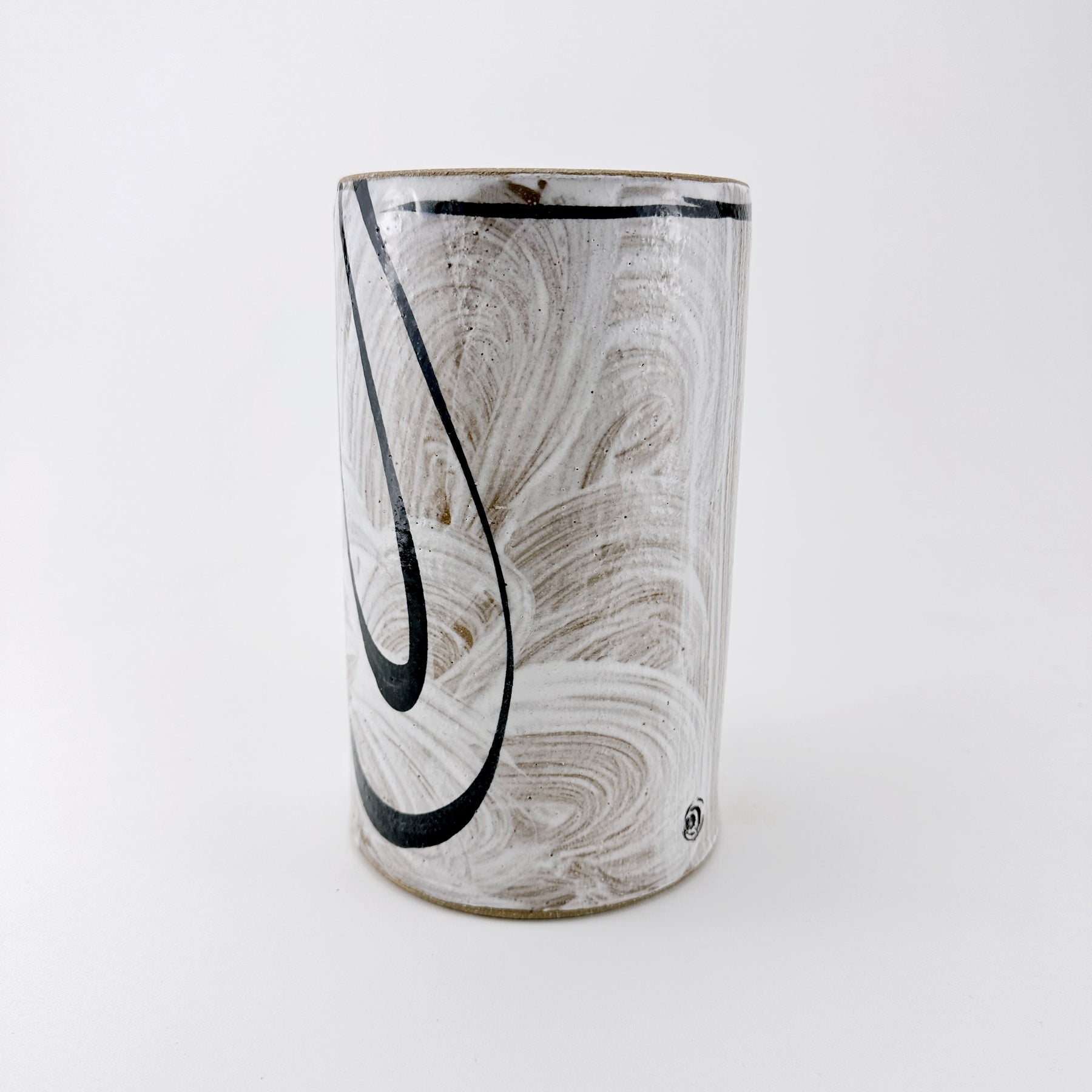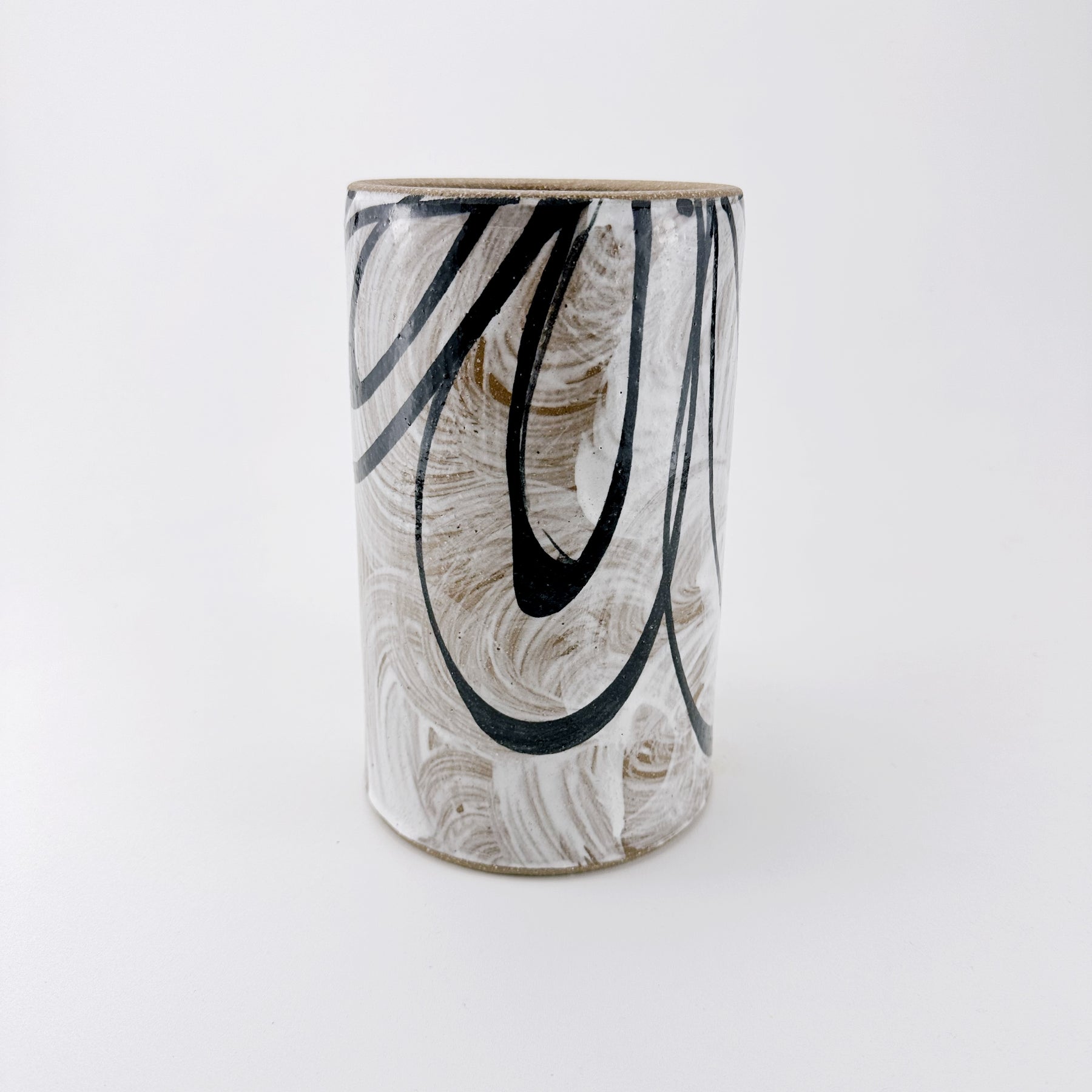 Bring a touch of artful movement into your home with this one-of-a-kind ceramic vessel. Hand-thrown and finished with expressive black brushwork over soft, textured white swirls, this piece is designed to feel both modern and organic. Its tall, cylindrical form makes it wonderfully versatile — display fresh or dried stems, or use it countertop-side as a stylish utensil holder.